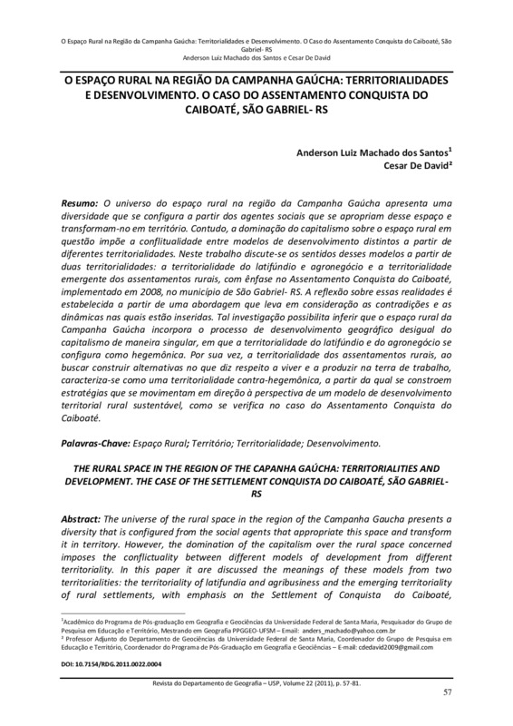O ESPAÇO RURAL NA REGIÃO DA CAMPANHA GAÚCHA: TERRITORIALIDADES E DESENVOLVIMENTO. O CASO DO ASSENTAMENTO CONQUISTA DO CAIBOATÉ, SÃO GABRIEL- RS