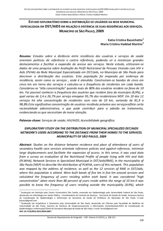ESTUDO EXPLORATÓRIO SOBRE A DISTRIBUIÇÃO DE USUÁRIOS DA REDE MUNICIPAL ESPECIALIZADA EM DST/AIDS EM RELAÇÃO À DISTÂNCIA DE SUAS RESIDÊNCIAS AOS SERVIÇOS. MUNICÍPIO DE SÃO PAULO, 2009