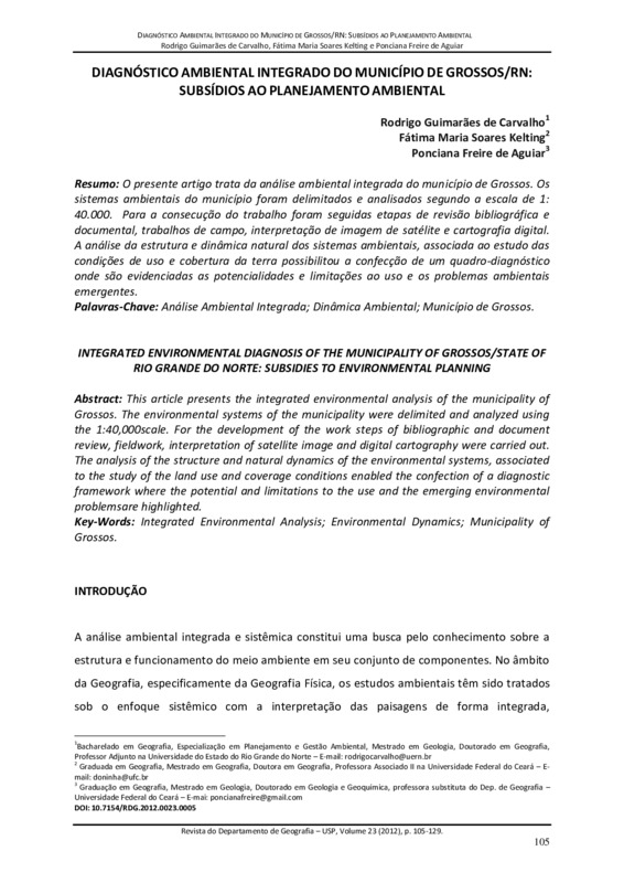 O presente artigo trata da análise ambiental integrada do município de Grossos. Os sistemas ambientais do município foram delimitados e analisados segundo a escala de 1: 40.000. Para a consecução do trabalho foram seguidas etapas de revisão bibliográfica e documental, trabalhos de campo, interpretação de imagem de satélite e cartografia digital. A análise da estrutura e dinâmica natural dos sistemas ambientais, associada ao estudo das condições de uso e cobertura da terra possibilitou a confecção de um quadro-diagnóstico onde são evidenciadas as potencialidades e limitações ao uso e os problemas ambientais emergentes.