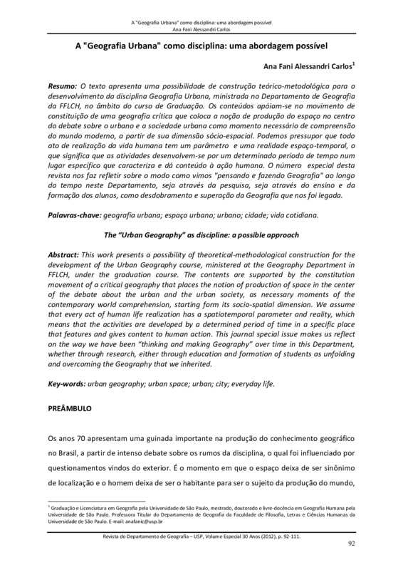 O texto apresenta uma possibilidade de construção teórico-metodológica para o desenvolvimento da disciplina Geografia Urbana, ministrada no Departamento de Geografia da FFLCH, no âmbito do curso de Graduação. Os conteúdos apóiam-se no movimento de constituição de uma geografia crítica que coloca a noção de produção do espaço no centro do debate sobre o urbano e a sociedade urbana como momento necessário de compreensão do mundo moderno, a partir de sua dimensão sócio-espacial. Podemos pressupor que todo ato de realização da vida humana tem um parâmetro e uma realidade espaço-temporal, o que significa que as atividades desenvolvem-se por um determinado período de tempo num lugar específico que caracteriza e dá conteúdo à ação humana. O número especial desta revista nos faz refletir sobre o modo como vimos "pensando e fazendo Geografia" ao longo do tempo neste Departamento, seja através da pesquisa, seja atravésdo ensino e da formação dos alunos, como desdobramento e superação da Geografia que nos foi legada