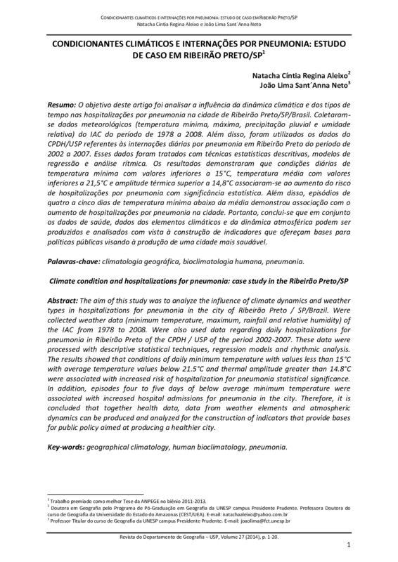 O objetivo deste artigo foi analisar a influência da dinâmica climática e dos tipos de tempo nas hospitalizações por pneumonia na cidade de Ribeirão Preto/SP/Brasil. Coletaram-se dados meteorológicos (temperatura mínima, máxima, precipitação pluvial e umidade relativa) do IAC do período de 1978 a 2008. Além disso, foram utilizados os dados do CPDH/USP referentes às internações diárias por pneumonia em Ribeirão Preto do período de 2002 a 2007. Esses dados foram tratados com técnicas estatísticas descritivas, modelos de regressão e análise rítmica. Os resultados demonstraram que condições diárias de temperatura mínima com valores inferiores a 15°C, temperatura média com valores inferiores a 21,5°C e amplitude térmica superior a 14,8°C associaram-se ao aumento do risco de hospitalizações por pneumonia com significância estatística. Além disso, episódios de quatro a cinco dias de temperatura mínima abaixo da média demonstrou associação com o aumento de hospitalizações por pneumonia na cidade. Portanto, conclui-se que em conjunto os dados de saúde, dados dos elementos climáticos e da dinâmica atmosférica podem ser produzidos e analisados com vista à construção de indicadores que ofereçam bases para políticas públicas visando à produção de uma cidade mais saudável.