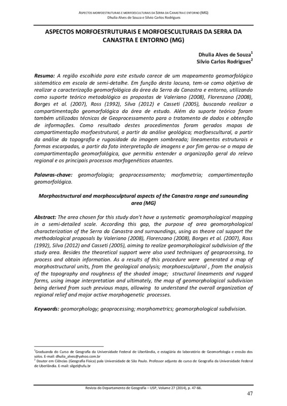 A região escolhida para este estudo carece de um mapeamento geomorfológico sistemático em escala de semi-detalhe. Em função desta lacuna, tem-se como objetivo de realizar a caracterização geomorfológica da área da Serra da Canastra e entorno, utilizando como suporte teórico metodológico as propostas de Valeriano (2008), Florenzano (2008), Borges et al. (2007), Ross (1992), Silva (2012) e Casseti (2005), buscando realizar a compartimentação geomorfológica da área de estudo. Além do suporte teórico foram também utilizadas técnicas de Geoprocessamento para o tratamento de dados e obtenção de informações. Como resultado destes procedimentos foram gerados mapas de compartimentação morfoestrutural, a partir da análise geológica; morfoescultural, a partir da análise da topografia e rugosidade da imagem sombreada; lineamentos estruturais e formas escarpadas, a partir da foto interpretação de imagens e por fim gerou-se o mapa de compartimentação geomorfológica, que permitiu entender a organização geral do relevo regional e os principais processos morfogenéticos atuantes.
