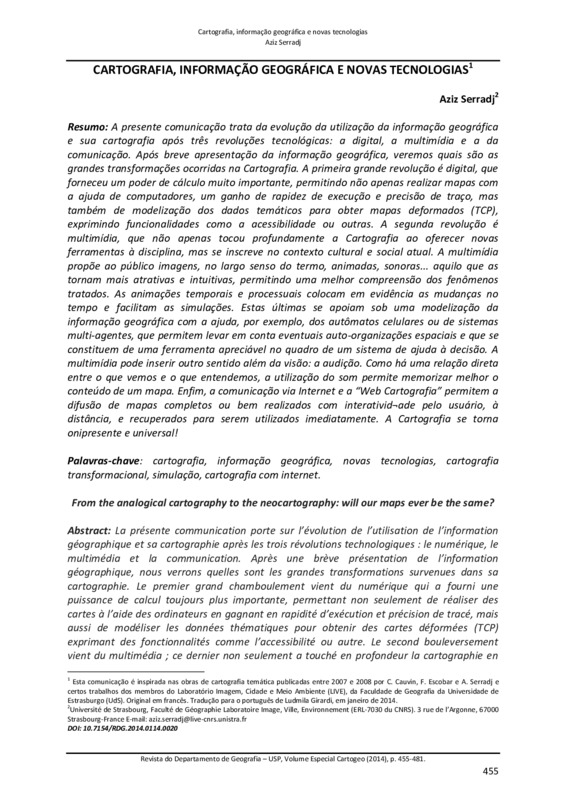 A presente comunicação trata da evolução da utilização da informação geográfica e sua cartografia após três revoluções tecnológicas: a digital, a multimídia e a da comunicação. Após breve apresentação da informação geográfica, veremos quais são as grandes transformações ocorridas na Cartografia. A primeira grande revolução é digital, que forneceu um poder de cálculo muito importante, permitindo não apenas realizar mapas com a ajuda de computadores, um ganho de rapidez de execução e precisão de traço, mas também de modelização dos dados temáticos para obter mapas deformados (TCP), exprimindo funcionalidades como a acessibilidade ou outras. A segunda revolução é multimídia, que não apenas tocou profundamente a Cartografia ao oferecer novas ferramentas à disciplina, mas se inscreve no contexto cultural e social atual. A multimídia propõe ao público imagens, no largo senso do termo, animadas, sonoras... aquilo que as tornam mais atrativas e intuitivas, permitindo uma melhor compreensão dos fenômenos tratados. As animações temporais e processuais colocam em evidência as mudanças no tempo e facilitam as simulações. Estas últimas se apoiam sob uma modelização da informação geográfica com a ajuda, por exemplo, dos autômatos celulares ou de sistemas multi-agentes, que permitem levar em conta eventuais auto-organizações espaciais e que se constituem de uma ferramenta apreciável no quadro de um sistema de ajuda à decisão. A multimídia pode inserir outro sentido além da visão: a audição. Como há uma relação direta entre o que vemos e o que entendemos, a utilização do som permite memorizar melhor o conteúdo de um mapa. Enfim, a comunicação via Internet e a “Web Cartografia” permitem a difusão de mapas completos ou bem realizados com interativid¬ade pelo usuário, à distância, e recuperados para serem utilizados imediatamente. A Cartografia se torna onipresente e universal!