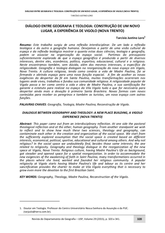 Este trabalho surgiu de uma reflexão interdisciplinar. De um lado a reflexão teológica e do outro a geografia humana. Desejamos a partir de uma visão cultural do espaço e da reflexão teológica mostrar o quanto estas duas ciências, teologia e geografia, podem se associar na organização do espaço social. Partimos do pressuposto suficientemente explorado de que o espaço geográfico é produzido a partir de diversos interesses, dentre eles, econômico, político, esportivo, educacional, cultural e o religioso. Neste encontramos também, sem dúvida, além dos mesmos interesses, o específico da religiosidade. Geografia e teologia dialogam na reorganização do novo espaço em Vigolo, Nova Trento. A cultura religiosa, tendo como cenário a vida de Madre Paulina, foi se firmando e abrindo espaço para uma nova função espacial. A fim de acolher as novas exigências do despertar da fé em Santa Paulina, muitas transformações ocorreram nos lugares onde viveu, trabalhou e fundou sua comunidade religiosa. A religiosidade popular de Vigolo passa a ter como centro a vida e obra de Madre Paulina, e sua santificação lhe garante o estatuto para realizar no espaço da Vila Vigolo tudo o que for necessário para despertar ainda mais a devoção à primeira Santa Brasileira. Novas formas com novos conteúdos para receber os peregrinos e também os turistas, um novo espaço com outras funções.