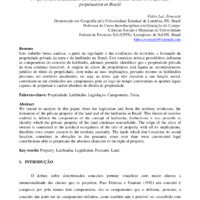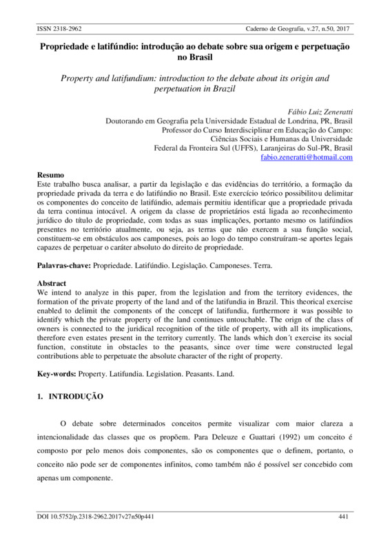 Este trabalho busca analisar, a partir da legislação e das evidências do território, a formação da propriedade privada da terra e do latifúndio no Brasil. Este exercício teórico possibilitou delimitar os componentes do conceito de latifúndio, ademais permitiu identificar que a propriedade privada da terra continua intocável. A origem da classe de proprietários está ligada ao reconhecimento jurídico do título de propriedade, com todas as suas implicações, portanto mesmo os latifúndios presentes no território atualmente, ou seja, as terras que não exercem a sua função social, constituem-se em obstáculos aos camponeses, pois ao logo do tempo construíram-se aportes legais capazes de perpetuar o caráter absoluto do direito de propriedade.Palavras-chave: Propriedade. Latifúndio. Legislação. Camponeses. Terra.AbstractWe intend to analyze in this paper, from the legislation and from the territory evidences, the formation of the private property of the land and of the latifundia in Brazil. This theorical exercise enabled to delimit the components of the concept of latifundia, furthermore it was possible to identify which the private property of the land continues untouchable. The orign of the class of owners is connected to the juridical recognition of the title of property, with all its implications, therefore even estates present in the territory currently. The lands which don´t exercise its social function, constitute in obstacles to the peasants, since over time were constructed legal contributions able to perpetuate the absolute character of the right of property.Key-words: Property. Latifundia. Legislation. Peasants. Land.