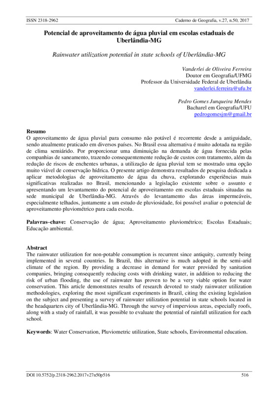 O aproveitamento de água pluvial para consumo não potável é recorrente desde a antiguidade, sendo atualmente praticado em diversos países. No Brasil essa alternativa é muito adotada na região de clima semiárido. Por proporcionar uma diminuição na demanda de água fornecida pelas companhias de saneamento, trazendo consequentemente redução de custos com tratamento, além da redução de riscos de enchentes urbanas, a utilização de água pluvial tem se mostrado uma opção muito viável de conservação hídrica. O presente artigo demonstra resultados de pesquisa dedicada a aplicar metodologias de aproveitamento de água da chuva, explorando experiências mais significativas realizadas no Brasil, mencionando a legislação existente sobre o assunto e apresentando um levantamento do potencial de aproveitamento em escolas estaduais situadas na sede municipal de Uberlândia-MG. Através do levantamento das áreas impermeáveis, especialmente telhados, juntamente a um estudo de pluviosidade, foi possível avaliar o potencial de aproveitamento pluviométrico para cada escola.Palavras–chave: Conservação de água; Aproveitamento pluviométrico; Escolas Estaduais; Educação ambiental.Abstract The rainwater utilization for non-potable consumption is recurrent since antiquity, currently being implemented in several countries. In Brazil, this alternative is much adopted in the semi-arid climate of the region. By providing a decrease in demand for water provided by sanitation companies, bringing consequently reducing costs with drinking water, in addition to reducing the risk of urban flooding, the use of rainwater has proven to be a very viable option for water conservation. This article demonstrates results of research devoted to study rainwater utilization methodologies, exploring the most significant experiments in Brazil, citing the existing legislation on the subject and presenting a survey of rainwater utilization potential in state schools located in the headquarters city of Uberlândia-MG. Through the survey of impervious areas, especially roofs, along with a study of rainfall, it was possible to evaluate the potential of rainfall utilization for each school.Keywords: Water Conservation, Pluviometric utilization, State schools, Environmental education