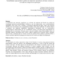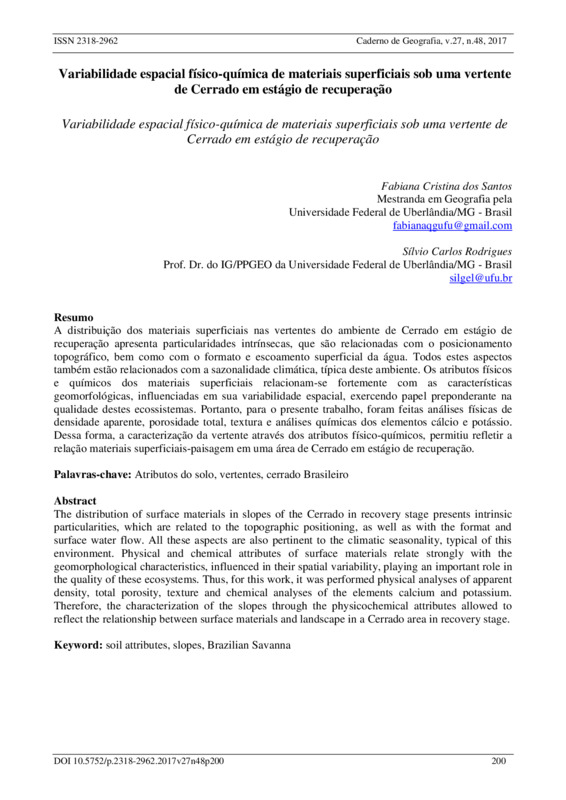 A distribuição dos materiais superficiais nas vertentes do ambiente de Cerrado em estágio de recuperação apresenta particularidades intrínsecas, que são relacionadas com o posicionamento topográfico, bem como com o formato e escoamento superficial da água. Todos estes aspectos também estão relacionados com a sazonalidade climática, típica deste ambiente. Os atributos físicos e químicos dos materiais superficiais relacionam-se fortemente com as características geomorfológicas, influenciadas em sua variabilidade espacial, exercendo papel preponderante na qualidade destes ecossistemas. Portanto, para o presente trabalho, foram feitas análises físicas de densidade aparente, porosidade total, textura e análises químicas dos elementos Cálcio e Potássio. Dessa forma, a caracterização da vertente através dos atributos físico-químicos, permitiu entender a relação materiais superficiais-paisagem em uma área de Cerrado em estágio de recuperação.