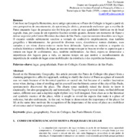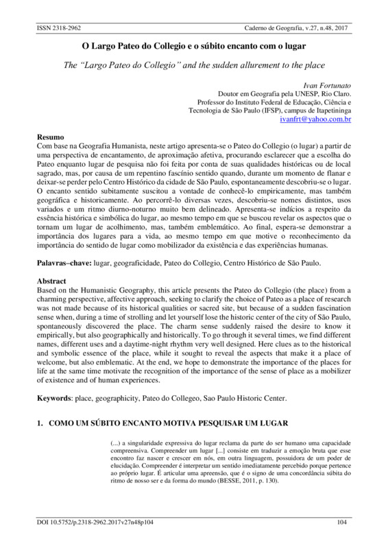 Com base na Geografia Humanista, neste artigo apresenta-se o Pateo do Collegio (o lugar) a partir de uma perspectiva de encantamento, de aproximação afetiva, procurando esclarecer que a escolha do Pateo enquanto lugar de pesquisa não foi feita por conta de suas qualidades históricas ou de local sagrado, mas, por causa de um repentino fascínio sentido quando, durante um momento de flanar e deixar-se perder pelo Centro Histórico da cidade de São Paulo, espontaneamente descobriu-se o lugar. O encanto sentido subitamente suscitou a vontade de conhecê-lo empiricamente, mas também geográfica e historicamente. Ao percorrê-lo diversas vezes, descobriu-se nomes distintos, usos variados e um ritmo diurno-noturno muito bem delineado. Apresenta-se indícios a respeito da essência histórica e simbólica do lugar, ao mesmo tempo em que se buscou revelar os aspectos que o tornam um lugar de acolhimento, mas, também emblemático. Ao final, espera-se demonstrar a importância dos lugares para a vida, ao mesmo tempo em que motive o reconhecimento da importância do sentido de lugar como mobilizador da existência e das experiências humanas.Palavras–chave: lugar, geograficidade, Pateo do Collegio, Centro Histórico de São Paulo.Abstract Based on the Humanistic Geography, this article presents the Pateo do Collegio (the place) from a charming perspective, affective approach, seeking to clarify the choice of Pateo as a place of research was not made because of its historical qualities or sacred site, but because of a sudden fascination sense when, during a time of strolling and let yourself lose the historic center of the city of São Paulo, spontaneously discovered the place. The charm sense suddenly raised the desire to know it empirically, but also geographically and historically. To go through it several times, we find different names, different uses and a daytime-night rhythm very well designed. Here clues as to the historical and symbolic essence of the place, while it sought to reveal the aspects that make it a place of welcome, but also emblematic. At the end, we hope to demonstrate the importance of the places for life at the same time motivate the recognition of the importance of the sense of place as a mobilizer of existence and of human experiences.Keywords: place, geographicity, Pateo do Collegeo, Sao Paulo Historic Center.