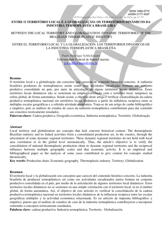 O território local e a globalização são conceitos que carecem de conteúdo histórico concreto. A indústria brasileira produtora de termoplásticos assim como suas atividades encadeadas formam um conjunto produtivo consolidado no país, por meio da articulação de alguns territórios locais dinâmicos. Esses territórios locais dinâmicos não se sustentam na simples correlação com o território local, tampouco na esfera global, de forma automática. Sendo assim, o objetivo deste artigo é verificar a consolidação da cadeia produtiva termoplástica nacional em territórios locais dinâmicos a partir da influência recíproca entre as múltiplas escalas geográficas e a referida atividade econômica. Trata-se de um artigo de cunho bibliográfico e empírico, pois as análises de estudos de casos da indústria termoplástica contribuíram para dar conteúdo aos conceitos teoricamente estudados.
