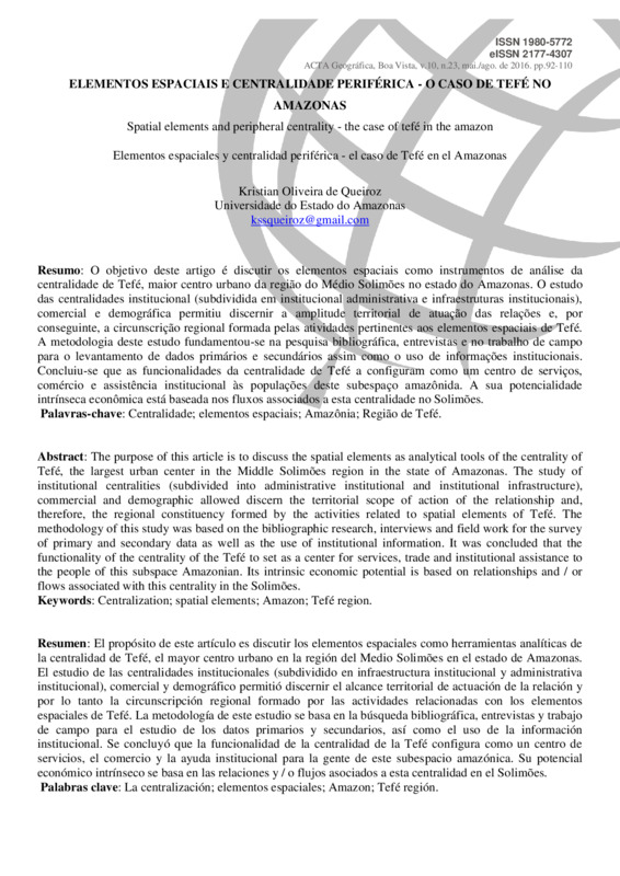 O objetivo deste artigo é discutir os elementos espaciais como instrumentos de análise da centralidade de Tefé, maior centro urbano da região do Médio Solimões no estado do Amazonas. O estudo das centralidades institucional (subdividida em institucional administrativa e infraestruturas institucionais), comercial e demográfica permitiu discernir a amplitude territorial de atuação das relações e, por conseguinte, a circunscrição regional formada pelas atividades pertinentes aos elementos espaciais de Tefé. A metodologia deste estudo fundamentou-se na pesquisa bibliográfica, entrevistas e no trabalho de campo para o levantamento de dados primários e secundários assim como o uso de informações institucionais. Concluiu-se que as funcionalidades da centralidade de Tefé a configuram como um centro de serviços, comércio e assistência institucional às populações deste subespaço amazônida. A sua potencialidade intrínseca econômica está baseada nos fluxos associados a esta centralidade no Solimões.
