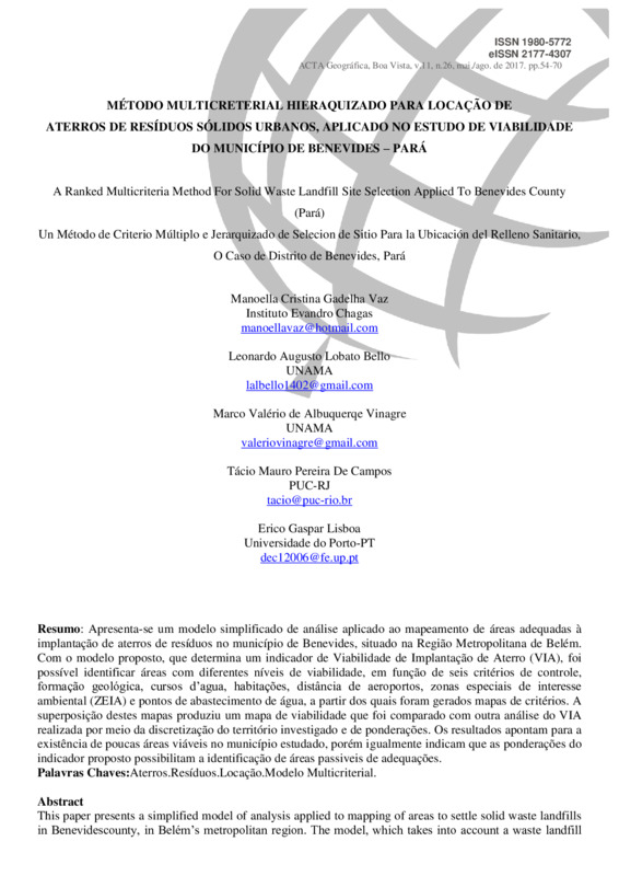 Este artigo apresenta um modelo simplificado de análise aplicado ao mapeamento de áreas adequadas à implantação de aterros de resíduos no município de Benevides, situado na Região Metropolitana de Belém. Com o modelo proposto, que determina um indicador de Viabilidade de Implantação de Aterro (VIA), foi possível identificar áreas com diferentes níveis de viabilidade em função de seis critérios de controle, formação geológica, cursos d’agua, habitações, distância de aeroportos, zonas especiais de interesse ambiental (ZEIA) e pontos de abastecimento de água; a partir dos quais foram gerados mapas de critérios. A superposição destes gerou um mapa de viabilidade que foi comparado com outra análise do VIA realizado por meio da discretização do território investigado e ponderações. Os resultados apontam para a existência de poucas áreas viáveis no município estudado, porém igualmente indicam que as ponderações do indicador proposto possibilitam a identificação de áreas passiveis de adequações. Concluiu-se, portanto, que o modelo proposto é viável como metodologia auxiliar de locação de aterros e que demonstrou que somente a sobreposição, sem definir grau de importância aos critérios, acaba por inviabilizar algumas áreas que poderiam ser adequadas para locar aterros sanitários futuramente