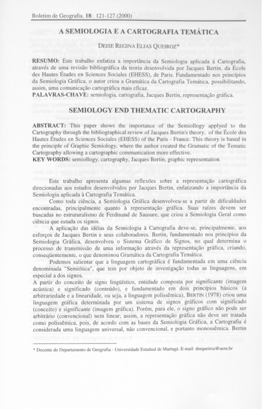 Este trabalho enfatiza a importância da Semiologia aplicada à Cartografia, através de uma revisão bibliográfica da teoria desenvolvida por Jacques Bertin, da École des Hautes Études en Sciences Sociales (EHESS), de Paris. Fundamentado nos princípios da Semiologia Gráfica, o autor criou a Gramática da Cartografia Temática, possibilitando, assim, uma comunicação cartográfica mais eficaz