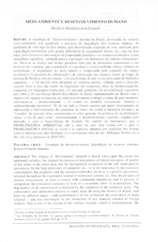A estratégia de "desenvolvimento" adotada no Brasil, divoreiada da variável sócio-ambiental, tem agudizado o proeesso de degradação dos recursos naturais, da qualidade de vida seja na área urbana, pela desordenada ocupação do solo, motivada pela especulação imobiliária, pela grande deficiência do saneamento básico, etc., seja na área rural, pela excessiva concentração da propriedade fundiária e os incentivos/subsídios a uma agricultura capitalista, orientada para a exportação em detrimento de culturas alimentares, etc. Deve-se ao avanço das frentes pioneiras num país de dimensões continentais e cm processo de ocupação, que a população se reproduza e cresça mediante esforço mínimo de acumulação. A degradação do meio natural é compensada pela expansão do espaço econômico. O processo de colonização e de valorização dos espaços vazios ao longo da história do Brasil se deu por etapas - com predomínio de um, ou da associação de múltiplos esquemas -, e foi movido pela produção de matérias primas, voltadas para o mercado externo. Essa é uma das razões da fragilidade dos esquemas, ditos de modernização.Os esquemas (1) oligárquico tradicional, (2) nacional populista, (3) da redefinição capitalista pós 1964 e (4) neo-liberal (Brasil Novo/Brasil do Real), implementados no Brasil com o objetivo de superar as barreiras do subdesenvolvimento e atingir o status de país moderno, efetivaram-se - invariavelmente -, às custas de modelos socialmente injustos e ambientalmente incorretos2. Se de um lado o Estado assume um papel determinante na intervenção e funcionamento da economia, de outro, ele exalta a iniciativa privada e as "virtudes" do mercado livre, notadamente no setor agrícola. As políticas de modernização viram "a lei do mais forte", desestruturando o desenvolvimento regional,, regidas pelo mercado e com a benevolência do Estdado No sentido de mostrarmos que a PROBLEMÁTICA AMBIENTAL não é mais do que uma forma sob a qual a PROBLEMÁTICA SOCIAL se revela e se expressa, optamos por explicitar três formas como a natureza tem sido abordada: (1) o ecologismo (fins do séc. XIX/anos 70-80); (2) a Rio -92 \ O) a definição do IDH/ONU.