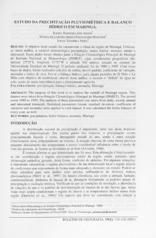 O objetivo deste estudo foi caracterizar o clima da região de Maringá. Utilizou- se, nesta análise, a variável meteorológica precipitação, dados diários, mensais, anuais e interanual. Esses dados foram obtidos junto a Estação Climatológica Principal de Maringá do Instituto Nacional de Meteorologia (INMET), cujas coordenadas geográficas são: latitude 23°25'S, longitude 51°57'W e altitude 542 metros, situada no campus da Universidade Estadual de Maringá. O período analisado foi de 1980 a 1999. Com essas bases de dados, foram realizados cálculos de média, desvio padrão, coeficiente de variação, anomalia e índice de seca. Fez-se o balanço hídrico, para alguns períodos de EI Nino e La Nina com objetivo de estabelecer, através desta análise, o excesso e "déficit" de água no solo, sendo de suma importância para o planejamento agrícola.