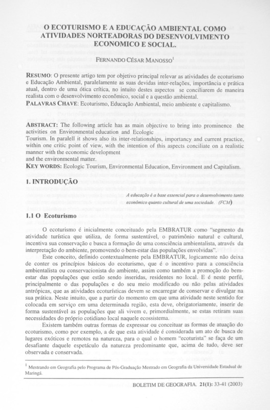 O ECOTURISMO E A EDUCAÇÃO AMBIENTAL COMO ATIVIDADES NORTEADORAS DO DESENVOLVIMENTO ECONOMICO E SOCIAL