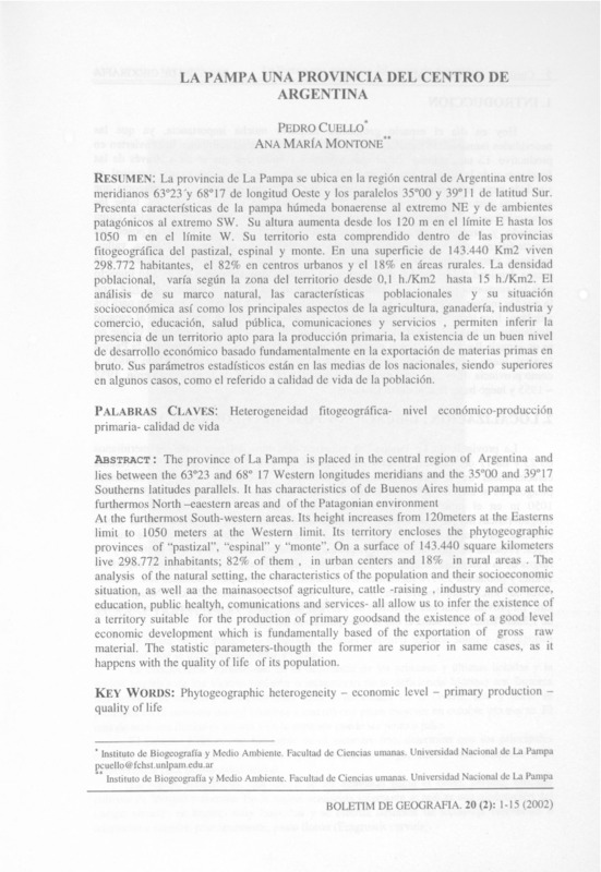 La província de La Pampa se ubica en la región central de Argentina entre los meridianos 63°23'y 68°17 de longitud Oeste y los paralelos 35°00 y 39°l 1 de latitud Sur. Presenta características de la pampa húmeda bonaerense al extremo NE y de ambientes patagónicos al extremo SW. Su altura aumenta desde los 120 m en el limite E hasta los 1050 m en el limite W. Su territorio esta comprendido dentro de las províncias fitogeográfica del pastizal, espinal y monte. En una superficie de 143.440 Km2 viven 298.772 habitantes, el 82% en centros urbanos y el 18% en áreas rurales. La densidad poblacional, varia scgûn la zona del territorio desde 0,1 h./Km2 hasta 15 h./Km2. El análisis de su marco natural, las características poblacionales y su situación socioeconómica así como los principales aspectos de la agricultura, ganadería, industria y comercio, educación, salud pública, comunicaciones y servicios , permiten inferir la presencia de un territorio apto para la producción primaria, la existencia de un buen nivel de desarrollo económico basado fundamentalmente en la exportación de matérias primas en bruto. Sus parâmetros estadísticos están en las medias de los nacionales, siendo superiores en algunos casos, como el referido a calidad de vida de la población.