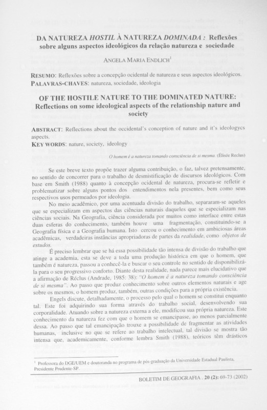 DA NATUREZA HOSTIL À NATUREZA DOMINADA : Reflexões sobre alguns aspectos ideológicos da relação natureza e sociedade
