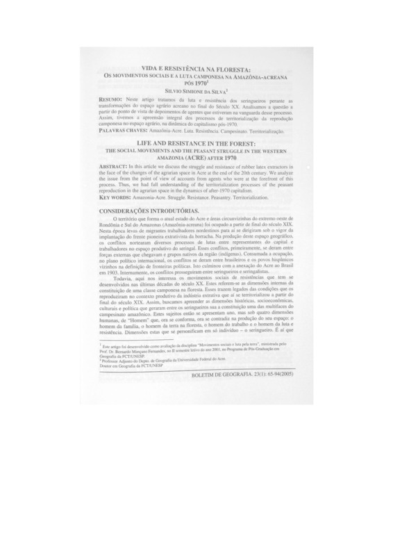 VIDA E RESISTÊNCIA NA FLORESTA: OS MOVIMENTOS SOCIAIS E A LUTA CAMPONESA NA AMAZÔNIA-ACREANA PÓS 1970