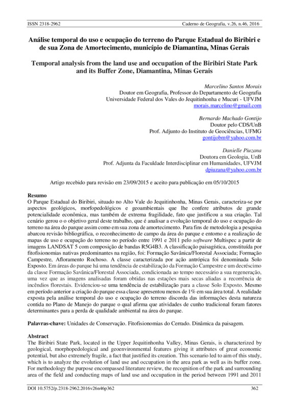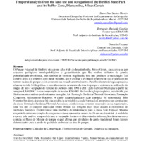O Parque Estadual do Biribiri, situado no Alto Vale do Jequitinhonha, Minas Gerais, caracteriza-se por aspectos geológicos, morfopedológicos e geoambientais que lhe confere atributos de grande potencialidade econômica, mas também de extrema fragilidade, fato que justificou a sua criação. Tal cenário gerou o o objetivo geral deste trabalho, que é analisar a evolução temporal do uso e ocupação do terreno na área do parque assim como em sua zona de amortecimento. Para fins de metodologia a pesquisa abarcou revisão bibliográfica, o reconhecimento de campo da área do parque e entorno e a realização de mapas de uso e ocupação do terreno no período entre 1991 e 2011 pelo software Multispec a partir de imagens LANDSAT 5 com composição de bandas R5G4B3. A classificação paisagística, constituída por fitofisionomias nativas predominantes na região, foi: Formação Savânica/Florestal Associada; Formação Campestre, Afloramento Rochoso. A classe caracterizada por ação antrópica foi denominada Solo Exposto. Em áreas do parque há uma tendência de estabilização da Formação Campestre e um decréscimo da classe Formação Savânica/Florestal Associada, condicionada ao tempo necessário a sua regeneração, uma vez que as imagens analisadas foram obtidas nas estações mais secas aliadas a recorrência de incêndios florestais. Evidenciou-se uma tendência de estabilização para a classe Solo Exposto. Mesmo em período anterior a criação do parque essa classe apresentou menos de 1% em sua área total. A realidade exposta pela análise temporal do uso e ocupação do terreno discorda das informações desta natureza contida no Plano de Manejo do parque o qual afirma que atividades de cunho tradicional foram fatores determinantes para a perda de qualidade ambiental na área do parque. Palavras-chave: Unidades de Conservação. Fitofisionomias do Cerrado. Dinâmica da paisagem. Abstract The Biribiri State Park, located in the Upper Jequitinhonha Valley, Minas Gerais, is characterized by geological, morphopedological and geoenvironmental features giving it attributes of great economic potential, but also extremely fragile, a fact that justified its creation. This scenario led to aim of this study, which is to analyze the evolution of land use and occupation in the area park as well as its buffer zone. For methodology the purpose encompassed literature review, the recognition of the park and surrounding area of the field and conducting maps of land use and occupation in the period between 1991 and 2011 by Multispec software from Landsat 5 images with composition bands R5G4B3. The landscape classification, consisting of native vegetation types in the region, was: Savanna/Forestry Associate Formation; Campestre Formation, Rocky Outcrop. The class characterized by human action was called Solo Exposed. The park area, for the period 1991/1994, there is a tendency of stabilization of Campestre Formation and a decrease of Savanna/Associated Forest Formation. This reduction is due to the time required for its regeneration since the images analyzed were obtained in the drier seasons combined recurrence of forest fires. The temporal maps showed a trend of stabilization for Exposed Soil class. Even in the period before the creation of the park this category was less than 1% in your area. The reality exposed by temporal analysis of the land use and occupation disagrees with the information in question contained in Management Plan of the Biribiri Park, which states that traditional nature activities were determining factors for the loss of environmental quality in areas of the parks. Keywords : Protected Areas. Cerrado vegetation types. Landscape dynamics.