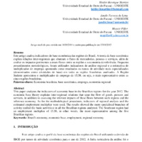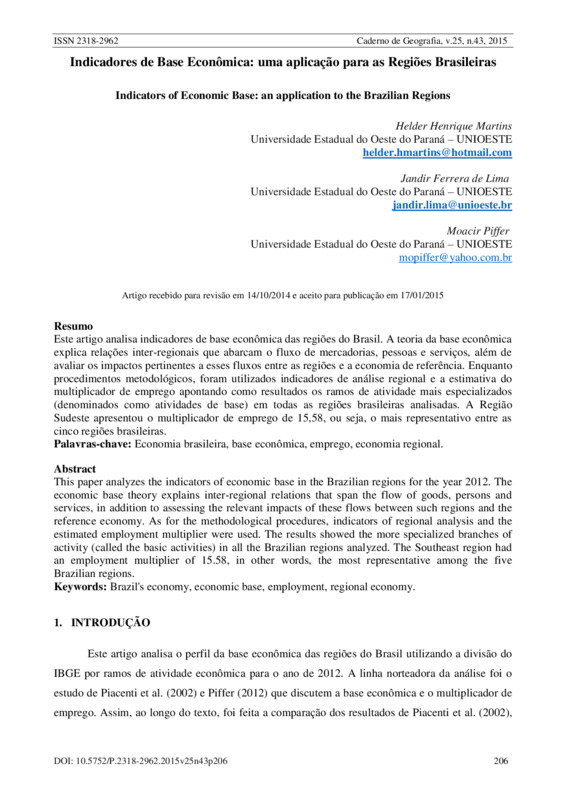 Este artigo analisa indicadores de base econômica das regiões do Brasil. A teoria da base econômica explica relações inter-regionais que abarcam o fluxo de mercadorias, pessoas e serviços, além de avaliar os impactos pertinentes a esses fluxos entre as regiões e a economia de referência. Enquanto procedimentos metodológicos, foram utilizados indicadores de análise regional e a estimativa do multiplicador de emprego apontando como resultados os ramos de atividade mais especializados (denominados como atividades de base) em todas as regiões brasileiras analisadas. A Região Sudeste apresentou o multiplicador de emprego de 15,58, ou seja, o mais representativo entre as cinco regiões brasileiras.Palavras-chave: Economia brasileira, base econômica, emprego, economia regional.AbstractThis paper analyzes the indicators of economic base in the Brazilian regions for the year 2012. The economic base theory explains inter-regional relations that span the flow of goods, persons and services, in addition to assessing the relevant impacts of these flows between such regions and the reference economy. As for the methodological procedures, indicators of regional analysis and the estimated employment multiplier were used. The results showed the more specialized branches of activity (called the basic activities) in all the Brazilian regions analyzed. The Southeast region had an employment multiplier of 15.58, in other words, the most representative among the five Brazilian regions. Keywords: Brazil's economy, economic base, employment, regional economy.