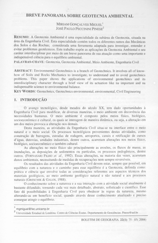 A Geotecnia Ambiental é uma especialidade da subárea de Geotecnia, situada na área da Engenharia Civil. Esta especialidade contém todos os diferentes ramos das Mecânicas dos Solos e das Rochas; considerada uma ferramenta adaptada para investigar, entender e evitar problemas geotécnicos. Este trabalho expõe as aplicações da Geotecnia Ambiental e seu caráter interdisciplinar por meio de um breve panorama de sua atuação como uma importante e indispensável ciência para o equilíbrio ambiental.