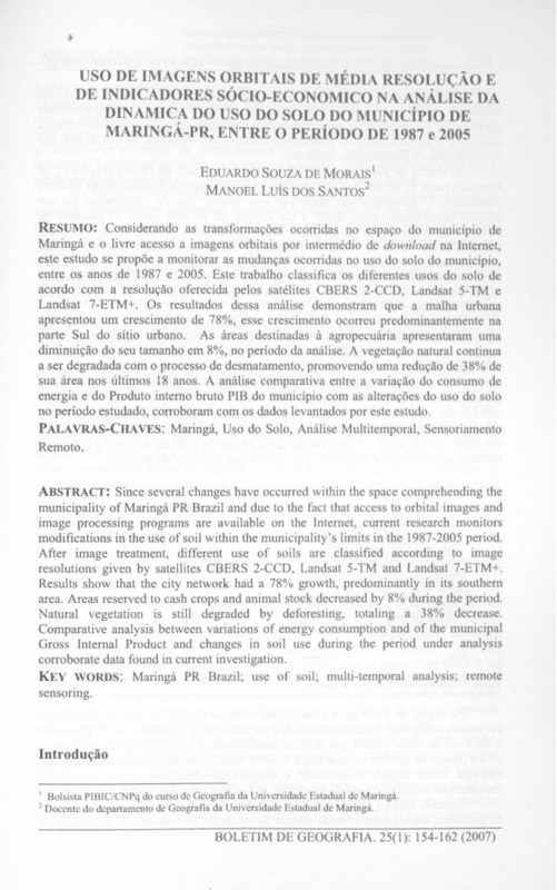 USO DE IMAGENS ORBITAIS DE MÉDIA RESOLUÇÃO E DE INDICADORES SÓCIO-ECONOMICO NA ANÁLISE DA DINAMICA DO USO DO SOLO DO MUNICÍPIO DE MARINGÁ-PR, ENTRE O PERÍODO DE 1987 e 2005