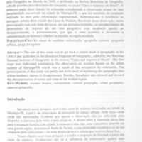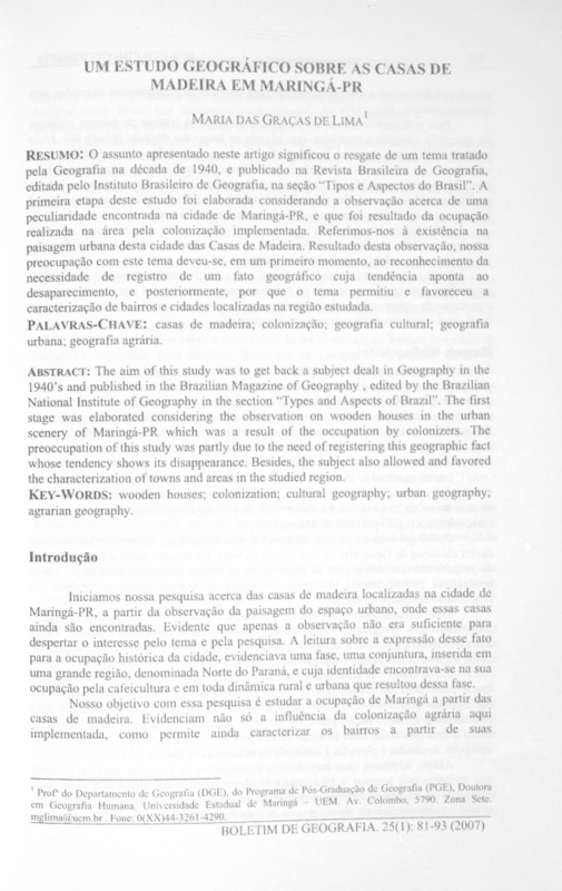 O assunto apresentado neste artigo significou o resgate de um tema tratado pela Geografia na década de 1940, e publicado na Revista Brasileira de Geografia, editada pelo Instituto Brasileiro de Geografia, na seção "Tipos e Aspectos do Brasil". A primeira etapa deste estudo foi elaborada considerando a observação acerca de uma peculiaridade encontrada na cidade de Maringá-PR, e que foi resultado da ocupação realizada na área pela colonização implementada. Referimos-nos à existência na paisagem urbana desta cidade das Casas de Madeira. Resultado desta observação, nossa preocupação com este tema deveu-se, em um primeiro momento, ao reconhecimento da necessidade de registro de um fato geográfico cuja tendência aponta ao desaparecimento, e posteriormente, por que o tema permitiu e favoreceu a caracterização de bairros e cidades localizadas na região estudada.