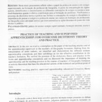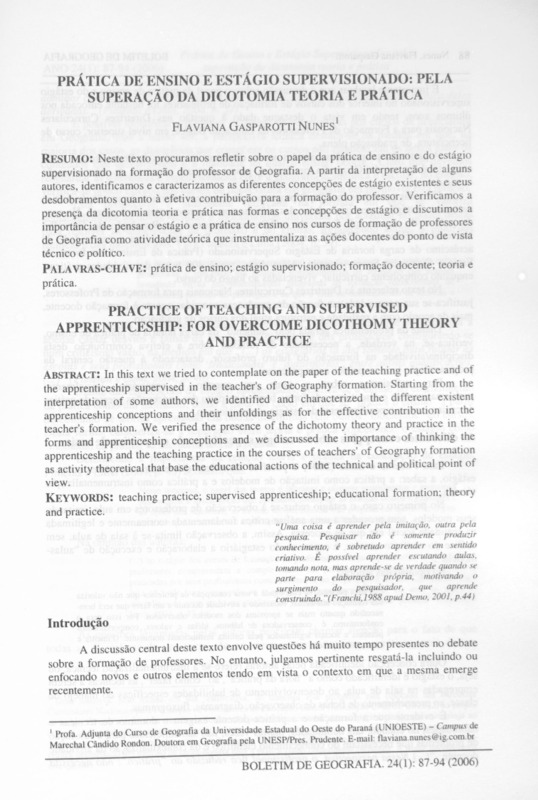 Neste texto procuramos refletir sobre o papel da prática de ensino e do estágio supervisionado na formação do professor de Geografia. A partir da interpretação de alguns autores, identificamos e caracterizamos as diferentes concepções de estágio existentes e seus desdobramentos quanto à efetiva contribuição para a formação do professor. Verificamos a presença da dicotomia teoria e prática nas formas e concepções de estágio e discutimos a importância de pensar o estágio e a prática de ensino nos cursos de formação de professores de Geografia como atividade teórica que instrumentaliza as ações docentes do ponto de vista técnico e político.