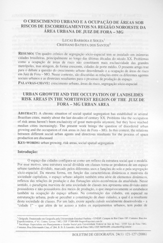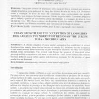 O CRESCIMENTO URBANO E A OCUPAÇÃO DE ÁREAS SOB RISCOS DE ESCORREGAMENTOS NA REGIÃO NOROESTE DA ÁREA URBANA DE JUIZ DE FORA - MG