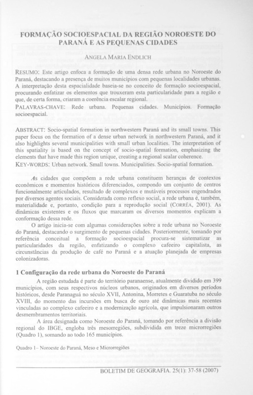 Este artigo enfoca a formação de uma densa rede urbana no Noroeste do Paraná, destacando a presença de muitos municípios com pequenas localidades urbanas. A interpretação desta espacialidade baseia-se no conceito de formação socioespacial, procurando enfatizar os elementos que trouxeram esta particularidade para a região e que, de certa forma, criaram a coerência escalar regional.