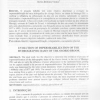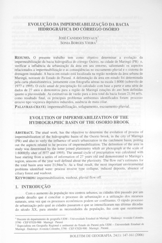 o presente trabalho tem como objetivo determinar a evolução da impermeabilização da bacia hidrográfica do córrego Osório, na cidade de Maringá (PR) e, verificar a influência da urbanização da área em seu entorno, salientando os aspectos relacionados a impermeabilização e as conseqüências no escoamento pluvial e o sistema de drenagem instalado. A bacia em estudo está localizada na região nordeste da área urbana de Maringá, noroeste do Estado do Paraná. A delimitação da área em estudo foi determinada pela carta planialtimétrica, juntamente com fotografia aéreas na escala 1:8000 (sobrevôo de 1977 e 1995). O ciclo anual de precipitação foi calculado com base a partir e uma série de dados de 27 anos e demonstrou para a região de Maringá estações do ano bem definidas quanto a pluviosidade. As estimativas de vazão para a área total da bacia foram 21,94 m3/s. como resultado final, os principais problemas ambientais identificados foram: processo erosivo tipo voçoroca depósitos induzidos, ausência de mata ciliar.