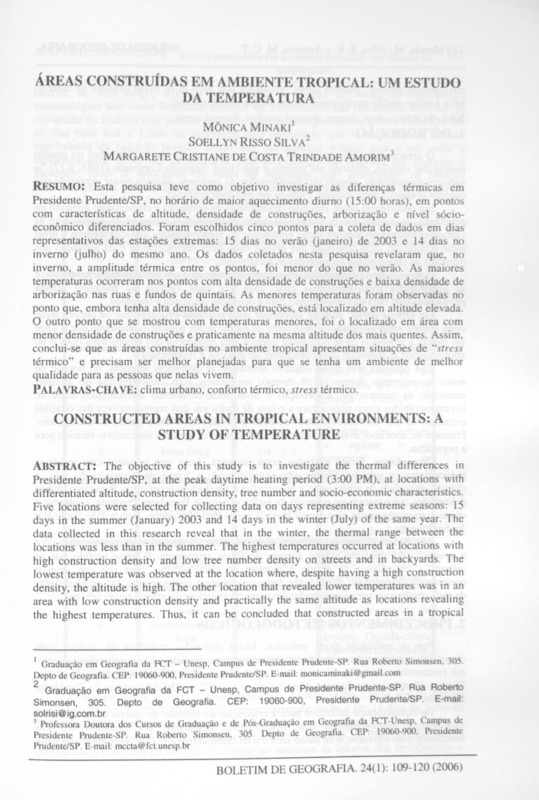Esta pesquisa teve como objetivo investigar as diferenças térmicas em Presidente Prudente/SP, no horário de maior aquecimento diurno (15:00 horas), em pontos com características de altitude, densidade de construções, arborização e nível socioeconómico diferenciados. Foram escolhidos cinco pontos para a coleta de dados em dias representativos das estações extremas: 15 dias no verão (janeiro) de 2003 e 14 dias no inverno (julho) do mesmo ano. Os dados coletados nesta pesquisa revelaram que, no inverno, a amplitude térmica entre os pontos, foi menor do que no verão. As maiores temperaturas ocorreram nos pontos com alta densidade de construções e baixa densidade de arborização nas ruas e fundos de quintais. As menores temperaturas foram observadas no ponto que, embora tenha alta densidade de construções, está localizado em altitude elevada. O outro ponto que se mostrou com temperaturas menores, foi o localizado em área com menor densidade de construções e praticamente na mesma altitude dos mais quentes. Assim, conclui-se que as áreas construídas no ambiente tropical apresentam situações de "stress térmico" e precisam ser melhor planejadas para que se tenha um ambiente de melhor qualidade para as pessoas que nelas vivem.