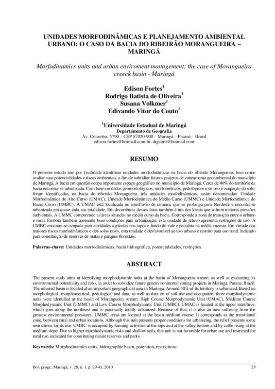 Unidades morfodinâmicas e planejamento ambiental urbano: o caso da bacia do ribeirão Morangueira – Maringá - doi: 10.4025/bolgeogr.v28i1.8837