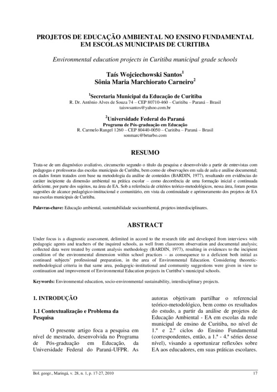 Projetos de educação ambiental no ensino fundamental em escolas municipais de Curitiba - doi: 10.4025/bolgeogr.v28i1.8017