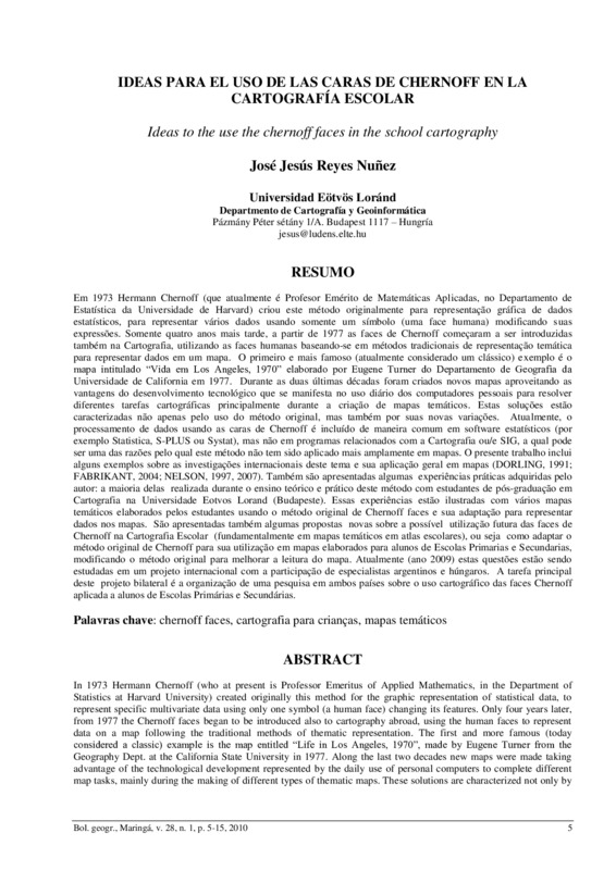 Em 1973 Hermann Chernoff (que atualmente é Profesor Emérito de Matemáticas Aplicadas, no Departamento de Estatística da Universidade de Harvard) criou este método originalmente para representação gráfica de dados estatísticos, para representar vários dados usando somente um símbolo (uma face humana) modificando suas expressões. Somente quatro anos mais tarde, a partir de 1977 as faces de Chernoff começaram a ser introduzidas também na Cartografia, utilizando as faces humanas baseando-se em métodos tradicionais de representação temática para representar dados em um mapa. O primeiro e mais famoso (atualmente considerado um clássico) exemplo é o mapa intitulado “Vida em Los Angeles, 1970” elaborado por Eugene Turner do Departamento de Geografia da Universidade de California em 1977. Durante as duas últimas décadas foram criados novos mapas aproveitando as vantagens do desenvolvimento tecnológico que se manifesta no uso diário dos computadores pessoais para resolver diferentes tarefas cartográficas principalmente durante a criação de mapas temáticos. Estas soluções estão caracterizadas não apenas pelo uso do método original, mas também por suas novas variações. Atualmente, o processamento de dados usando as caras de Chernoff é incluído de maneira comum em software estatísticos (por exemplo Statistica, S-PLUS ou Systat), mas não em programas relacionados com a Cartografia ou/e SIG, a qual pode ser uma das razões pelo qual este método não tem sido aplicado mais amplamente em mapas. O presente trabalho inclui alguns exemplos sobre as investigações internacionais deste tema e sua aplicação geral em mapas (DORLING, 1991; FABRIKANT, 2004; NELSON, 1997, 2007). Também são apresentadas algumas experiências práticas adquiridas pelo autor: a maioria delas realizada durante o ensino teórico e prático deste método com estudantes de pós-graduação em Cartografia na Universidade Eotvos Lorand (Budapeste). Essas experiências estão ilustradas com vários mapas temáticos elaborados pelos estudantes usando o método original de Chernoff faces e sua adaptação para representar dados nos mapas. São apresentadas também algumas propostas novas sobre a possível utilização futura das faces de Chernoff na Cartografia Escolar (fundamentalmente em mapas temáticos em atlas escolares), ou seja como adaptar o método original de Chernoff para sua utilização em mapas elaborados para alunos de Escolas Primarias e Secundarias, modificando o método original para melhorar a leitura do mapa. Atualmente (ano 2009) estas questões estão sendo estudadas em um projeto internacional com a participação de especialistas argentinos e húngaros. A tarefa principal deste projeto bilateral é a organização de uma pesquisa em ambos países sobre o uso cartográfico das faces Chernoff aplicada a alunos de Escolas Primárias e Secundárias.