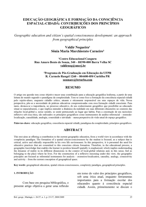 O artigo em questão tem como objetivo trazer uma contribuição para a educação geográfica hodierna, a partir de uma leitura de mundo segundo o paradigma da complexidade. Tem-se como foco a formação da consciência espacial-cidadã pelo sujeito-aluno, enquanto cidadão crítico, atuante e eticamente responsável em seus espaços de vida. Nessa perspectiva, põe-se a necessidade de práticas educativas compromissadas com essa formação cidadã consciente. Para tanto, destaca-se a importância, no processo educativo, de um conhecimento geográfico que possibilite ao educando situar-se espacialmente, o que implica entender a dinâmica da realidade em suas diferentes dimensões no contexto das relações local-global e, nesse sentido, se sentir pertencendo ao lugar que habita. Para a construção de um raciocínio reflexivo sob essa ótica, são enfocados os princípios geográficos como instrumentos de análise referencial - extensão-localização, causalidade, analogia, conexidade e atividade - numa perspectiva de visão atual do espaço geográfico.