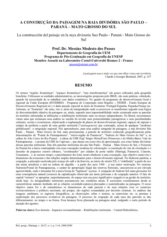 Os termos "regiões fronteiriças", "espaços fronteiriços", "raia transfronteiriça" são pouco utilizados pela geografia brasileira. Utilizamos as unidades administrativas, as microrregiões propostas pelo IBGE; são mais práticas, sobretudo, quando há necessidade de se trabalhar com dados estatísticos. No quadro de programas de desenvolvimento local e regional da União Européia (INTERREG - Programa de Cooperação entre Regiões -; FEDER - Fundo Europeu de Desenvolvimento Regional etc.) é dada atenção especial às áreas de fronteiras: Portugal-Espanha; Espanha-França etc. Ademais, as "fronteiras" são raias, isto é, áreas de intergradação onde os processos se manifestam segundo uma lógica de descontinuidade objetiva da paisagem ou, ainda, segundo uma impermeabilidade muito acentuada entre as parcelas do território submetidas às definições e redefinições territoriais mais ou menos independentes. No Brasil, encontramos várias raias que reclamam uma análise no sentido de revelar suas potencialidades paisagísticas e suas peculiaridades culturais, sociais e econômicas, objetivando a implantação de planos de desenvolvimento regional, capazes de superar o estágio de periferia a partir de uma gestão territorial ("aménagement) que contemple, acima de qualquer "modismo globalizante", a integração regional. Nós apreendemos, para uma análise integrada da paisagem, a raia divisória São Paulo - Paraná - Mato Grosso do Sul, mais precisamente, a parcela do território conhecido geograficamente pelas denominações de "Pontal do Paranapanema", "micro-região de Paranavaí", "Sudeste do Mato Grosso do Sul" e, as calhas do Alto Curso do Rio Paraná - à altura da UHE Engº Sérgio Motta/Porto Primavera e do Médio-Baixo Vale do Paranapanema - a jusante da UHE de Capivara -, que atuam ora como elos de aproximação, ora como linhas divisórias dessas parcelas territoriais. Das três parcelas territoriais da raia São Paulo - Paraná - Mato Grosso do Sul, o Noroeste do Paraná foi a única contemplada com uma concepção moderna de colonização: a construção de vias de circulação e o desenho de pequenos centros urbanos, "coordenados" por cidades de porte médio (Maringá, Paranavaí, Cianorte, Umuarama...); ao mesmo tempo, o parcelamento dos lotes rurais obedeceu a uma concepção, cujo objetivo maior era o dinamismo da economia e das relações amplas determinantes para o desenvolvimento regional. No Sudoeste paulista, a ocupação, a principio motivada pelo avanço do café e da ferrovia, no início do século XX, é "redefinida" a partir do uso das terras areníticas e terá na cultura do algodão - a partir dos anos 1940 - a sua maior motivação. No extremo Sudoeste/Pontal do Paranapanema, o caráter de apropriação ilegal das reservas florestais, caracterizou-se por elevada agressividade, onde o desmatar foi a única forma de "legitimar" a posse. A ocupação do Sudeste Sul mato-grossense foi uma consequência natural (osmose) da capitalização observada nas áreas próximas e de ocupação anterior. O fato do capital "externo" se apropriar, majoritariamente, do espaço tem um peso significativo (negativo) na gestão do território, ainda hoje. As desigualdades territoriais permanecem nas condições atuais. É necessário considerarmos desde as características naturais herdadas até as relações sociedade-natureza plasmadas e materializadas na paisagem. O nosso objetivo maior foi o de entendermos os dinamismos de cada parcela e de suas relações com os contextos socioeconômicos e políticos nacionais, até porque, são regiões comandadas por decisões externas. As análises das imagens satelitares, os registros fotográficos, as observações sobre o terreno, as entrevistas etc. se prestam à explicitação dos processos evolutivos da paisagem. O processo de ocupação de cada uma das parcelas se deu diferentemente: no tempo e na forma. Essa herança ficou plasmada na paisagem atual, malgrado o curto período de atuação dos agentes.
