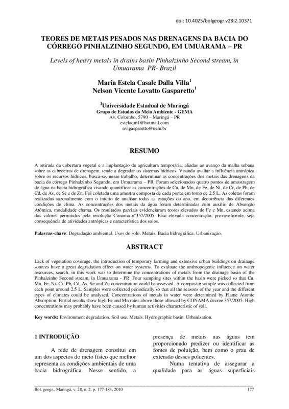 Teores de metais pesados nas drenagens da bacia do Córrego Pinhalzinho segundo, em Umuarama – PR - doi: 10.4025/bolgeogr.v28i2.10371
