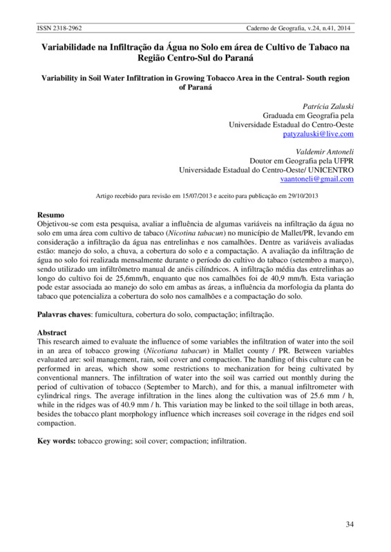 Variabilidade na Infiltração da Água no Solo em área de Cultivo de Tabaco na Região Centro-Sul do Paraná / Variability in Soil Water Infiltration in Growing Tobacco Area in the Central- South region of Paraná - DOI: 10.5752/P.2318-2962.2014v24n41p34