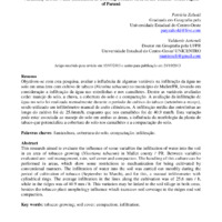 Objetivou-se com esta pesquisa, avaliar a influência de algumas variáveis na infiltração da água no solo em uma área com cultivo de tabaco (Nicotina tabacun) no município de Mallet/PR, levando em consideração a infiltração da água nas entrelinhas e nos camalhões. Dentre as variáveis avaliadas estão: manejo do solo, a chuva, a cobertura do solo e a compactação. A avaliação da infiltração de água no solo foi realizada mensalmente durante o período do cultivo do tabaco (setembro a março), sendo utilizado um infiltrômetro manual de anéis cilíndricos. A infiltração média das entrelinhas ao longo do cultivo foi de 25,6mm/h, enquanto que nos camalhões foi de 40,9 mm/h. Esta variação pode estar associada ao manejo do solo em ambas as áreas, a influência da morfologia da planta do tabaco que potencializa a cobertura do solo nos camalhões e a compactação do solo. Palavras chaves: fumicultura, cobertura do solo, compactação; infiltração. Abstract This research aimed to evaluate the influence of some variables the infiltration of water into the soil in an area of tobacco growing (Nicotiana tabacun) in Mallet county / PR. Between variables evaluated are: soil management, rain, soil cover and compaction. The handling of this culture can be performed in areas, which show some restrictions to mechanization for being cultivated by conventional manners. The infiltration of water into the soil was carried out monthly during the period of cultivation of tobacco (September to March), and for this, a manual infiltrometer with cylindrical rings. The average infiltration in the lines along the cultivation was of 25.6 mm / h, while in the ridges was of 40.9 mm / h. This variation may be linked to the soil tillage in both areas, besides the tobacco plant morphology influence which increases soil coverage in the ridges end soil compaction. Key words: tobacco growing; soil cover; compaction; infiltration.