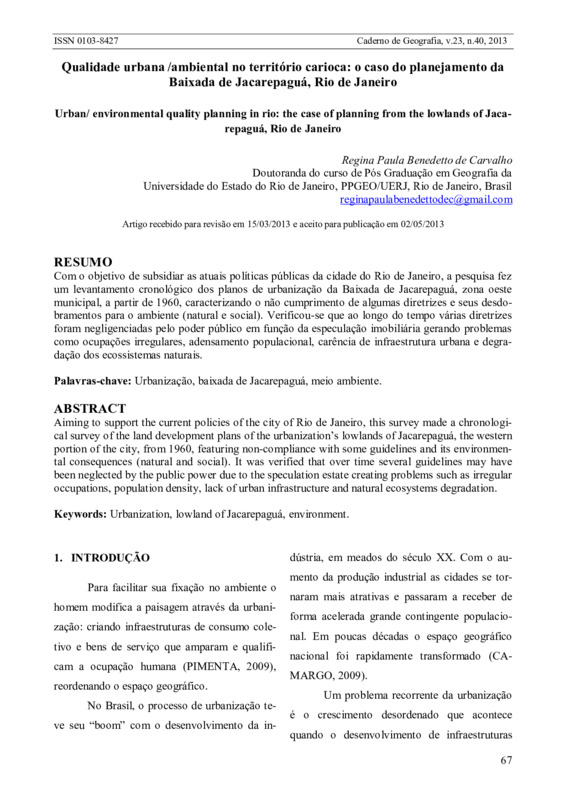 Qualidade urbana-ambiental no território carioca: o caso do planejamento da Baixada de Jacarepaguá, Rio de Janeiro / Urban-environmental quality environmental planning in rio: the case of planning from the (...)