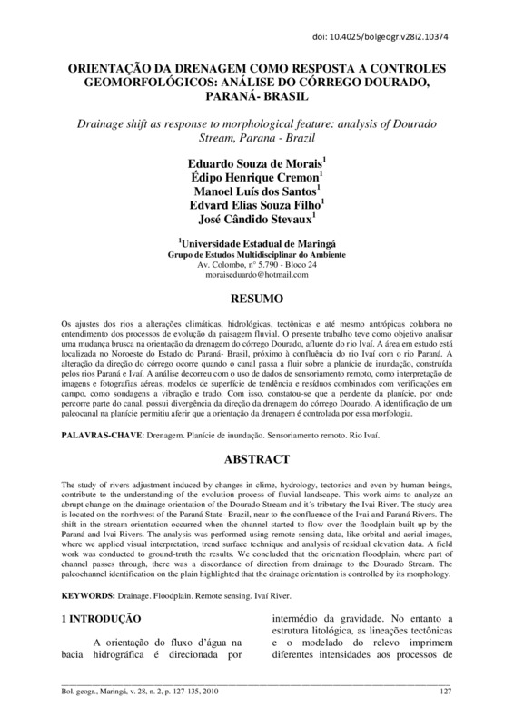 Os ajustes dos rios a alterações climáticas, hidrológicas, tectônicas e até mesmo antrópicas colabora no entendimento dos processos de evolução da paisagem fluvial. O presente trabalho teve como objetivo analisar uma mudança brusca na orientação da drenagem do córrego Dourado, afluente do rio Ivaí. A área em estudo está localizada no Noroeste do Estado do Paraná- Brasil, próximo à confluência do rio Ivaí com o rio Paraná. A alteração da direção do córrego ocorre quando o canal passa a fluir sobre a planície de inundação, construída pelos rios Paraná e Ivaí. A análise decorreu com o uso de dados de sensoriamento remoto, como interpretação de imagens e fotografias aéreas, modelos de superfície de tendência e resíduos combinados com verificações em campo, como sondagens a vibração e trado. Com isso, constatou-se que a pendente da planície, por onde percorre parte do canal, possui divergência da direção da drenagem do córrego Dourado. A identificação de um paleocanal na planície permitiu aferir que a orientação da drenagem é controlada por essa morfologia