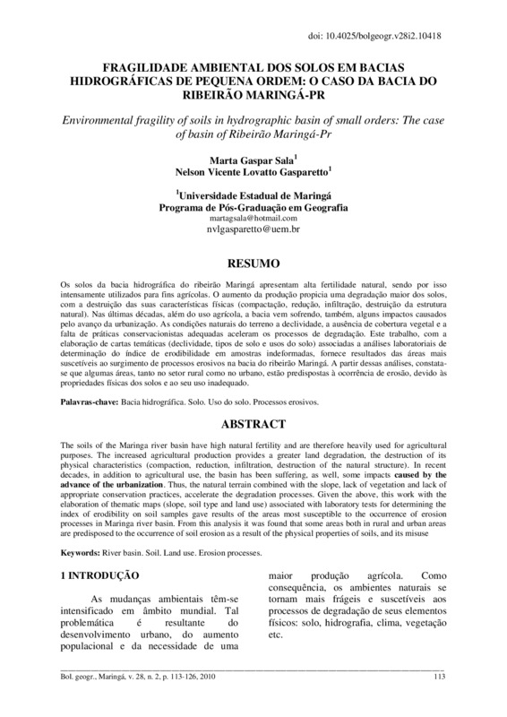 Fragilidade ambiental dos solos em bacias hidrográficas de pequena ordem: o caso da bacia do Ribeirão Maringá-PR - doi: 10.4025/bolgeogr.v28i2.10418