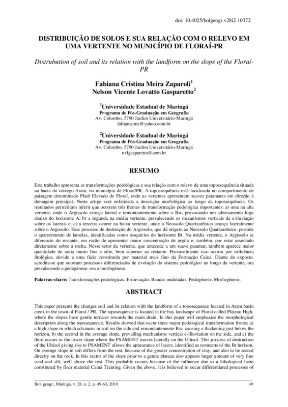Distribuição de solos e sua relação com o relevo em uma vertente no município de Floraí-PR - doi: 10.4025/bolgeogr.v28i2.10372