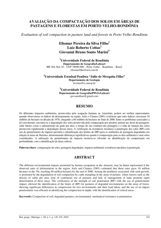 Avaliação da compactação dos solos em áreas de pastagens e florestas em Porto Velho-Rondônia - doi: 10.4025/bolgeogr.v28i1.8441
