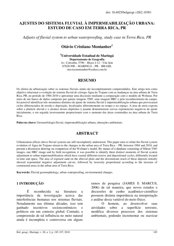 A interferência humana nos sistemas ambientais tem sido amplamente pesquisada nas últimas décadas principalmente por incentivos sócio-econômicos e políticos. Porém, algumas questões ainda são incompletamente reconhecidas, como os efeitos da urbanização sobre os sistemas fluviais. Este artigo tem como objetivo relacionar a evolução do sistema fluvial do Córrego Água do Trajano com as mudanças estruturais na área urbana de Terra Rica - PR, no período de 1984 - 2010 e apresentar uma discussão através da comparação entre esse estudo de caso com o modelo tradicionalmente citado na literatura. A partir de um extenso banco de dados composto por imagens orbitais, pelo reconhecimento de campo e revisão bibliográfica foi possível identificar dois momentos distintos de ajuste do sistema fluvial à impermeabilização urbana que provocaram dois ciclos diferenciados de erosão e deposição, localizados diferentemente no tempo e no espaço, além de um provável ciclo inicial, que não possui registro.
