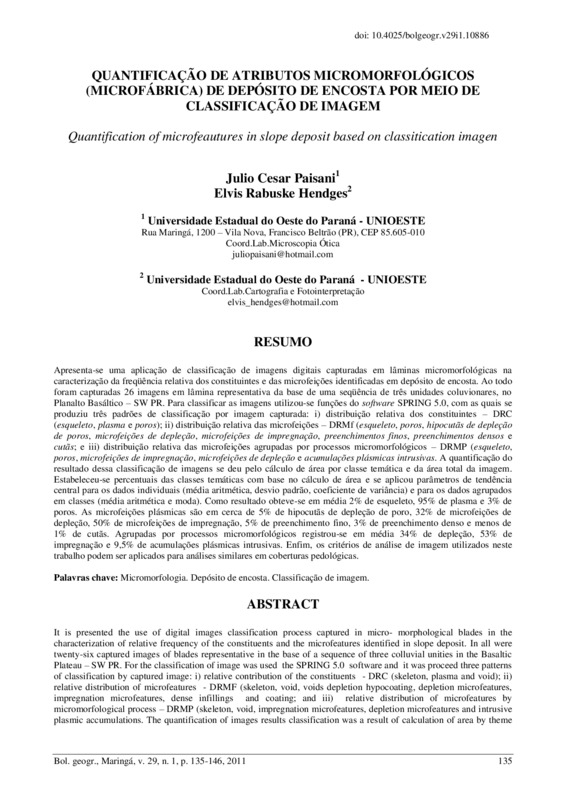 Quantificação de atributos micromorfológicos (microfábrica) de depósito de encosta por meio de classificação de imagem - doi: 10.4025/bolgeogr.v29i1.10886