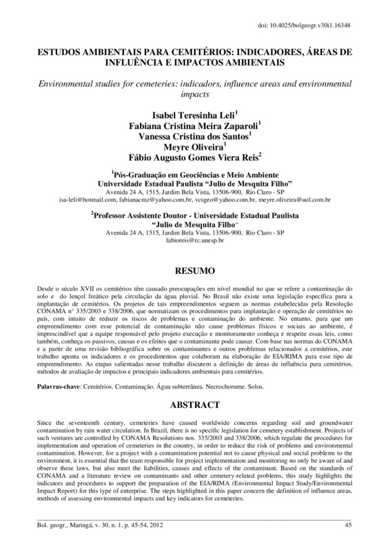 Estudos ambientais para cemitérios: indicadores, áreas de influência e impactos ambientais - doi: 10.4025/bolgeogr.v30i1.16348