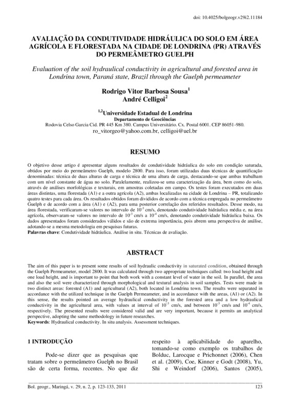 Avaliação da condutividade hidráulica do solo em área agrícola e florestada na cidade de Londrina (PR) através do permeâmetro Guelph - doi