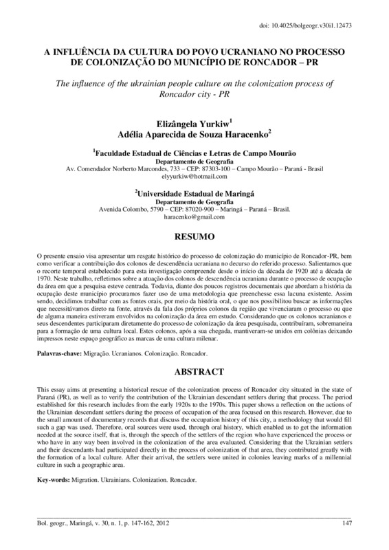 A influência da cultura do povo ucraniano no processo de colonização do município de Roncador – PR - doi: 10.4025/bolgeogr.v30i1.12473
